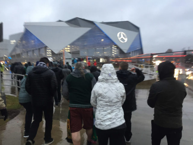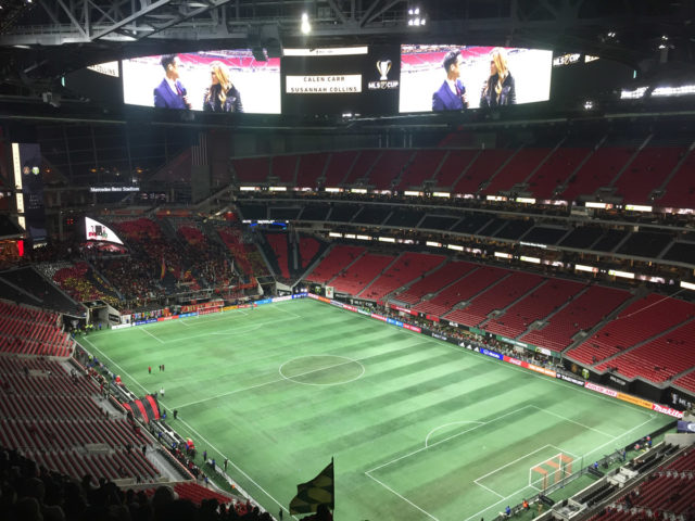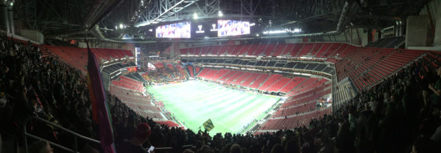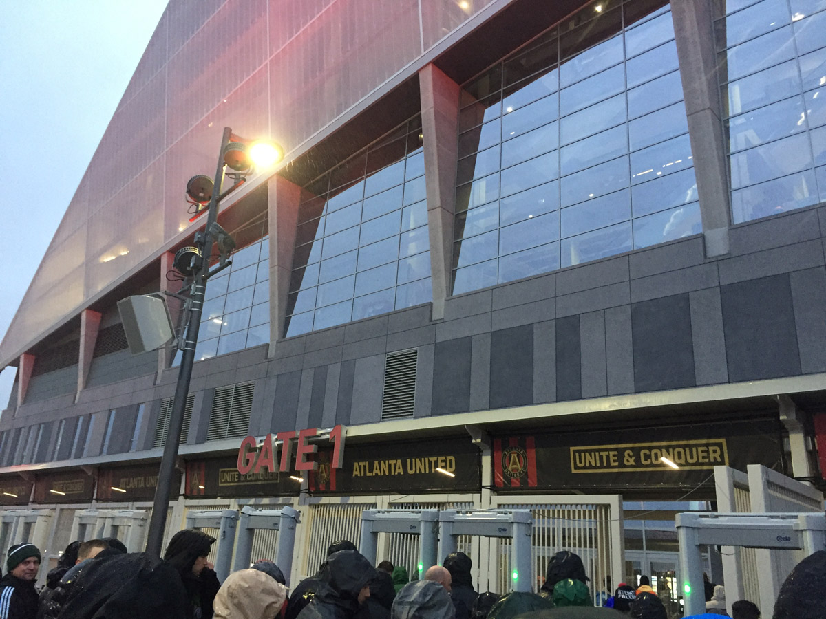 But wow, look at that stadium! At first it was awe inspiring. Our section was at a similar elevation and location to Seattle away accommodations. No bad seats, but hard to make out individual players. After a while, the aura of the surrounding faded. The atmosphere is a lot more glitzy than most MLS experiences. Yes, it’s more like an NFL spectacle, With music and loudspeakers, train whistles and prompts on the Jumbotron. The tifo was competently executed, though not entirely interesting. It has since come out that they get some front office renburesenent for their tifo operations. That has been debated though.  I talked with many supporters on the concourses, most of which seems to be fairly new to the game of soccer, but were genuinely enthusiastic. The Atlanta match day and supporters experience is definitely a different beast, one that I expect will evolve some.