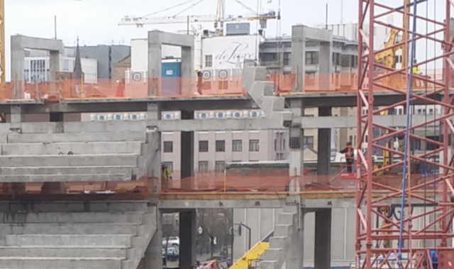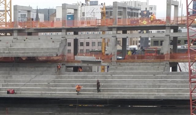 In this picture you can see that the seating rows are made from precast concrete lowered into place on the hangers by crane.