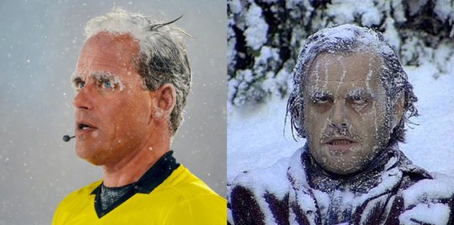 Some games are legendary because of the run of play. Our 2019 season opener in Colorado will be infamous for what happened on the pitch in a different way. A disappointing draw, sure, but highly memorable. In fact, the coldest game in MLS history so far. It was officially 18 degrees at kickoff, but unofficially reported as low as 16 degrees during the match. However, It’s not the cold that made it memorable, but the snow. That’s William H. Macy doppelgänger and referee Drew Fischer doing his unintentional impersonation of Jack Nicholson in The Shinning thanks to an image put together by Jacqueline Pi.