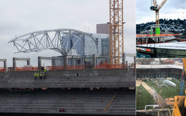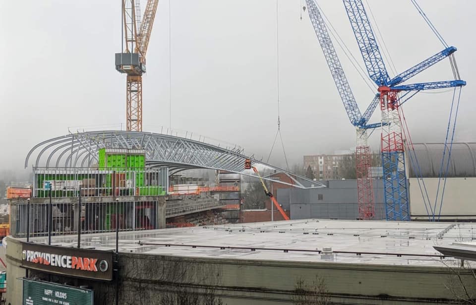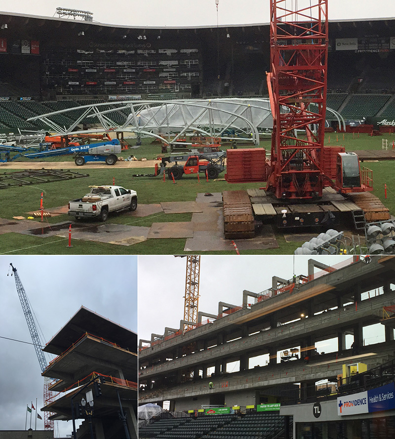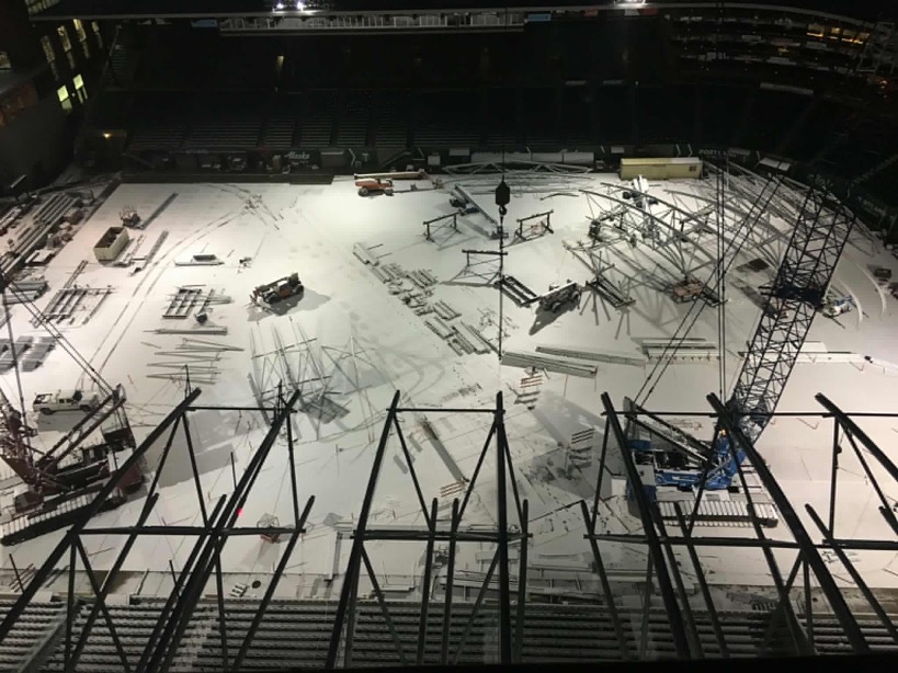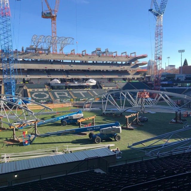 I’m not going to lie. I spend way too much time refreshing the live construction cam at Providence Park, but for the past few weeks all the assembly action has been happening out of frame. The official Providence Park feed doesn’t update daily, but I did find another Twitter feed from @bobthebuilder4u that’s got some gold in it. Welding and semi trucks driving around on the pitch look so… wrong. Bob makes more updates than Providence Park. He’s a construction guy so he’s chiming in on what’s going on. After you’ve watched a few of his videos you realize he’s not on the actual crew, and he’s just a guy who belongs to the MAC club. Yes, I said “MAC Club,” But at least I didn’t say “The MLS.” On a side note, it drives me nuts that Bob holds his phone in portrait mode while he shoots those videos, so I drove downtown to try and get my own photos. I ended up slinking into Providence Sports Care Center until I was politely, asked to leave. All the photos from inside the park were taken behind the glass.