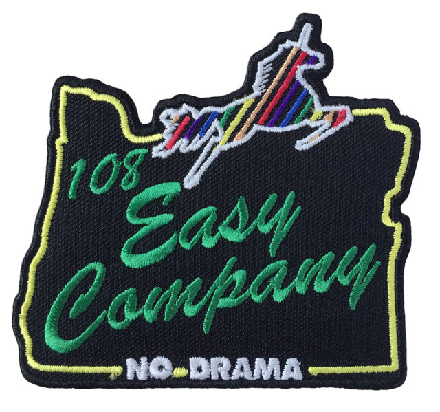 One of three versions of the same patch. Based on the Made in Oregon sign, with a unicorn replacing the stag. What is it with those 108ers and unicorns…