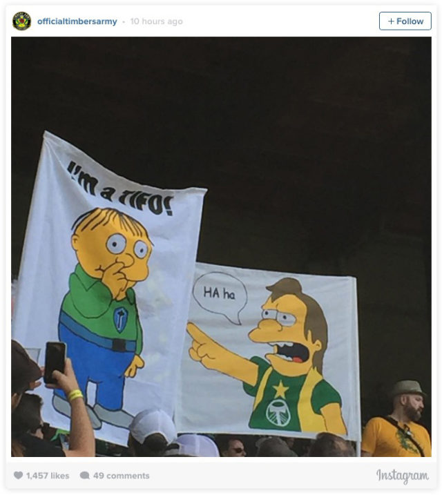 Inspired by the Nelson 2-stick painted by Desert Corps member Samantha, unveiled in the Tucson preseason match against Seattle. Mulhouse and Ralph Wiggum were added make it self contained. Eventually the 2-stick would make it Portland for a regular season match vs. Seattle, where it was joined by a 2 stick Ralph Wiggum making fun of ECS tifo blunders. Proceeds from this patch were used to give away 300 patches, fund a merit badge, and gift three 107ist memberships.