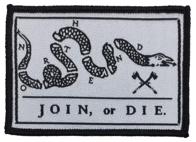 Based on Ben Franklin’s Join or Die cartoon.