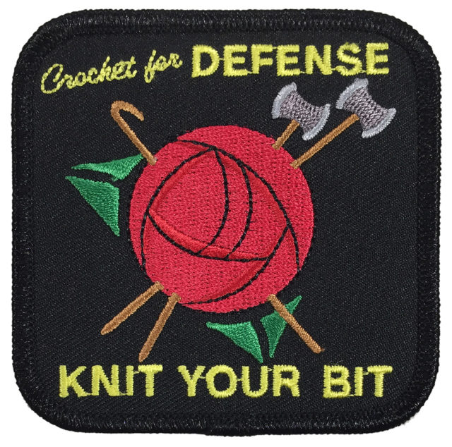 Axes as knitting needles, inspired by WWI and WWII knitting propaganda posters and created for members of TALK (Timbers Army Loopers and Knitters). Proceeds benefited Giselle Courier Memorial Fund.