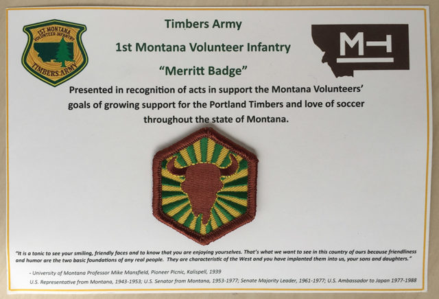 Requirements: Supporters can earn the badge through good works in support of the Montana Volunteers Regional Supporters Group, or by attending a Timbers or Thorns watch party in Montana, or by traveling from Montana to any Timbers or Thorns match.