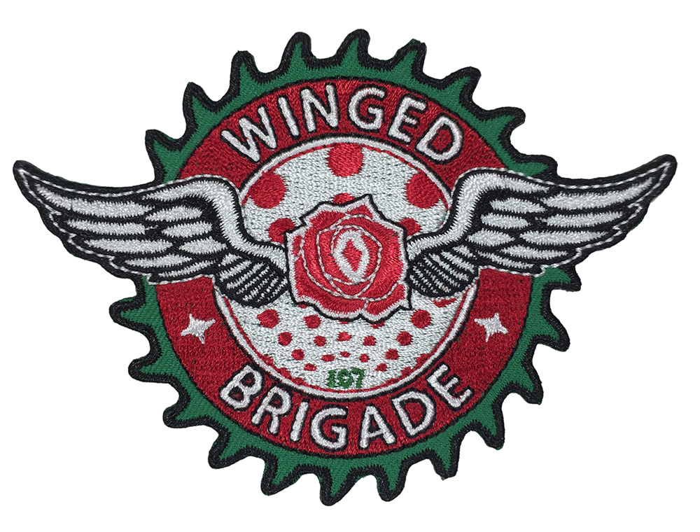 This was the first sectional patch created for the Rose City Riveters. Inspired by the Oregon State moto “She flies with her own wings” and the Von Dutch flying eyeball, I created this crest originally as a submission for the Rose City Riveters crest competition in 2013. The flying rose represents the moto and the Rose City. The three four-pointed stars, one to either side of the rose and one in the center of the rose, come from the flag of Portland and represent the club, supporters group, and the community. The entire patch is surrounded by a protective row of thorns. The section is located in 107 and signified by the red and white, flying rose flag that has been flown behind the goal since the very first home game. The patch quantity was deliberate, 325 patches were created – one for every seat in section 107 plus one for the archives.
